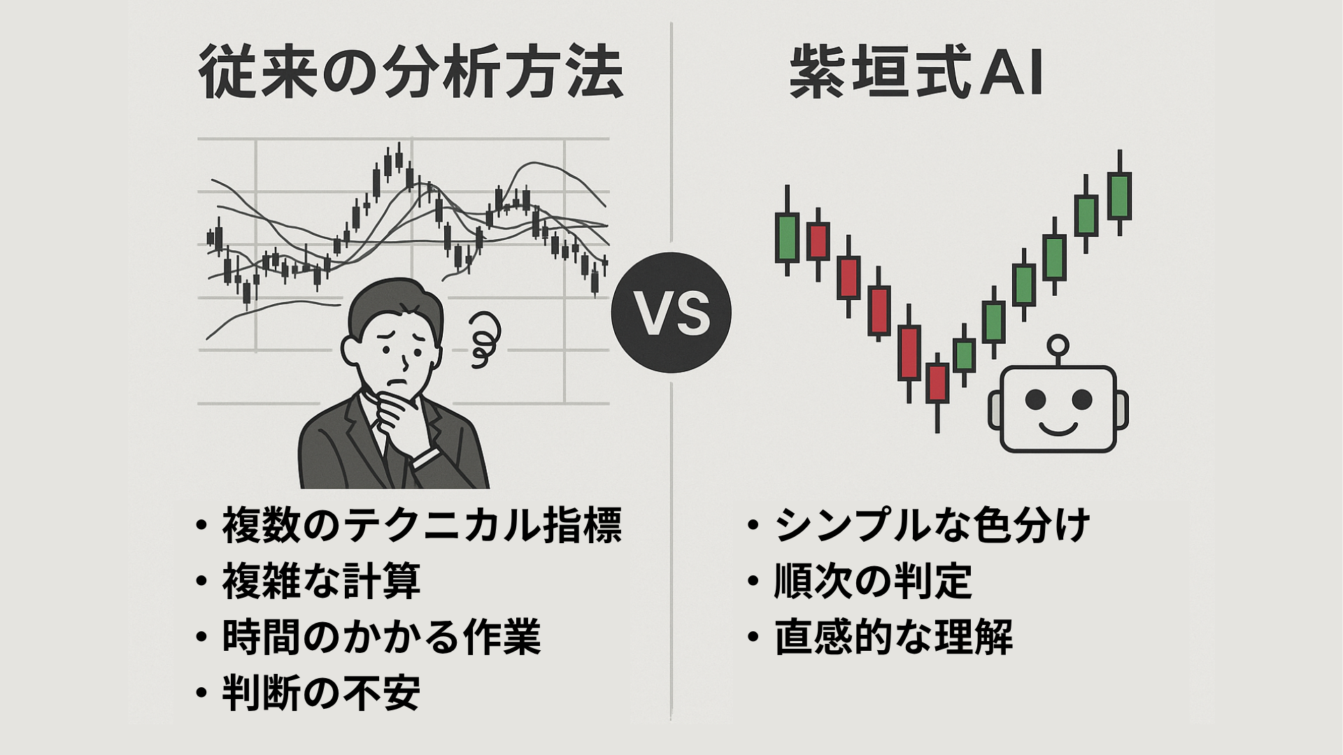 A: 最大の違いは「見るだけで分かる」シンプルさです。複雑なインジケーターや数値を覚える必要がありません。また、私の40年間の投資経験から導き出したパターンをAI化している点も特徴です。無料でありながら、有料ツール並みの機能を提供しています。